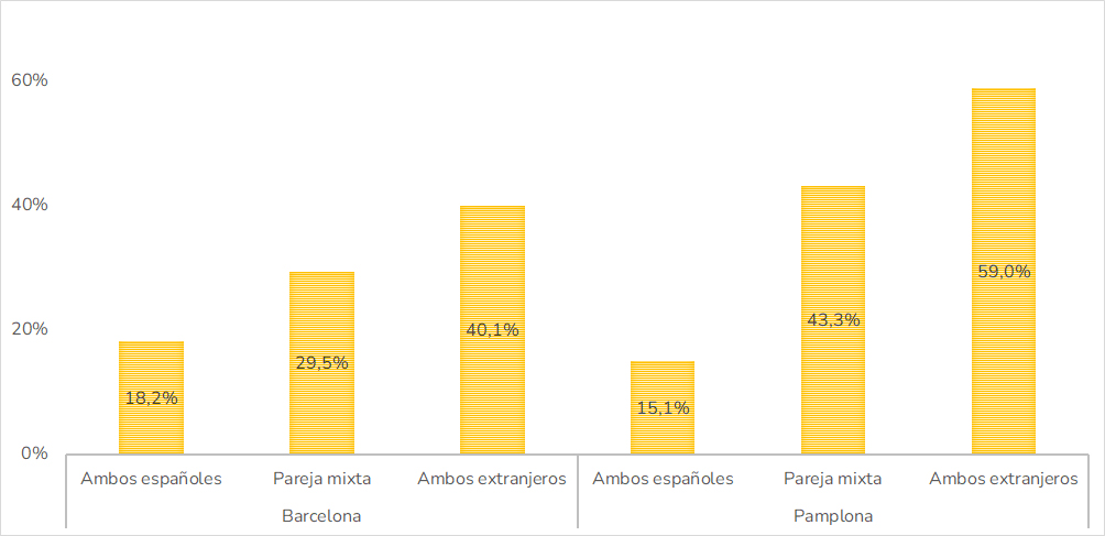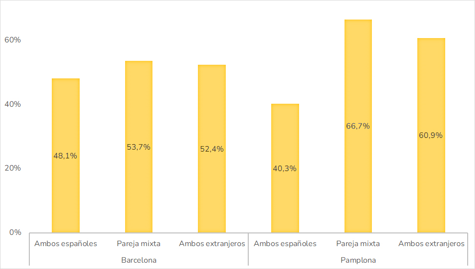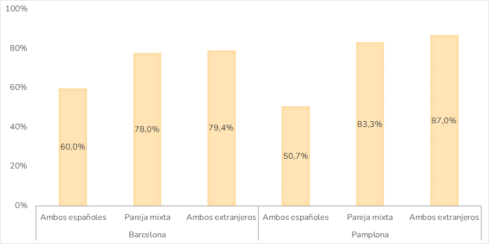 En Barcelona las diferencias no son significativas (p-valor=0,746), pero sí en Pamplona (p-valor=0,048). En Pamplona existe una mayor presencia de uniones consensuales entre matrimonios mixtos y extranjeros (66,7% y 60,9%, respectivamente), que la que existe entre matrimonios formados exclusivamente por españoles (40,3%).