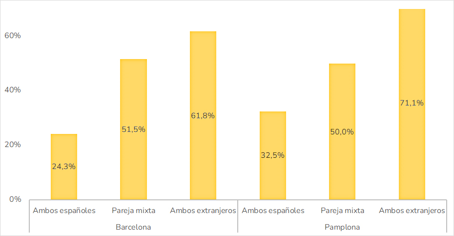 Tanto en Barcelona como en Pamplona las diferencias en función del contexto migratorio son significativas (p-valor=0,006 y p-valor<0,001, respectivamente). En ambos territorios, y haciendo la consideración anterior, la prevalencia de la vulnerabilidad (no disponer de vivienda propia) es menor cuando ambos miembros son españoles y aumenta en parejas mixtas y extranjeras.