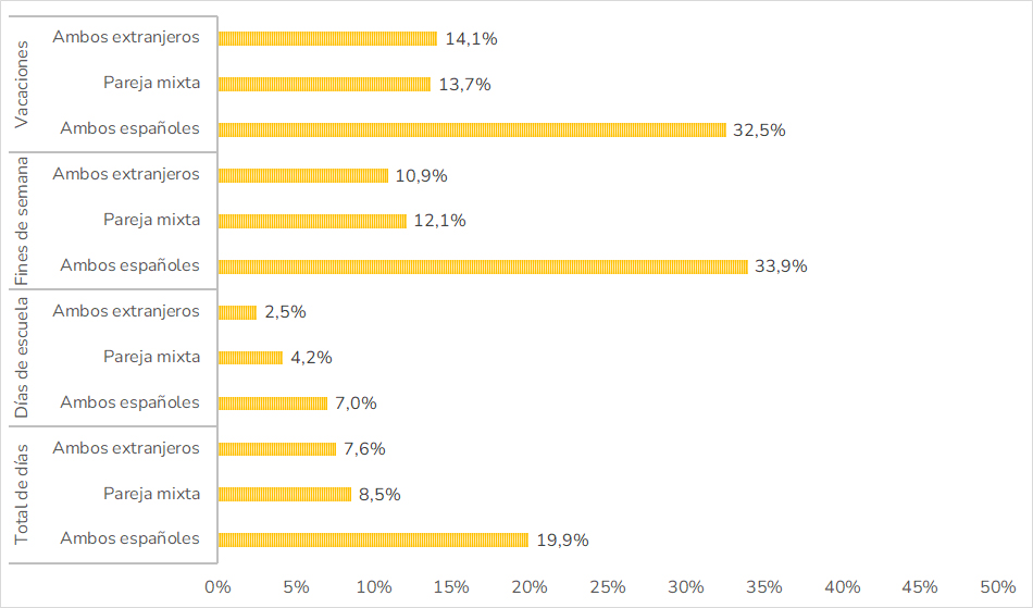 Las diferencias entre parejas españolas y parejas migrantes o mixtas son claramente significativas (p-valor<0,001), y en el sentido de mayor vulnerabilidad para las parejas con algún miembro extranjero. Así, de las 365 noches que tiene un año, los hijos/as de parejas con ambos miembros españoles pernoctan con el padre en 73 ocasiones, mientras que cuando ambos miembros son extranjeros o en parejas mixtas el número de noches se reduce a 28 y a 31, respectivamente. Tal y como puede observarse en la siguiente figura, la diferencia se evidencía mucho más en períodos vacacionales —ya sean durante las vacaciones escolares o los fines de semana—, que en los días que podríamos denominar como estrictamente laborables.
