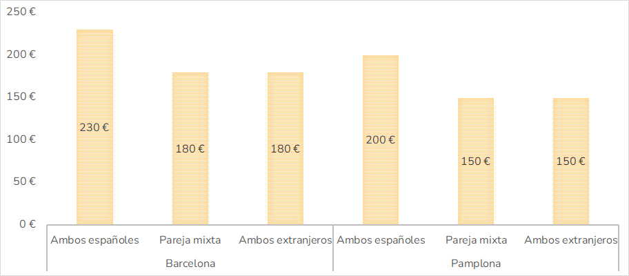 En Barcelona, la mitad de los padres de parejas españolas deben pagar 230€ o más en concepto de pensión a los hijos, una cifra que en parejas con algún (o ambos) miembros extranjeros, se reduce a 180€ (p-valor=0,003). A pesar de que en Pamplona los resultados apuntan en la misma dirección (respectivamente, 200€ y 150€), las diferencias no son estadísticamente significativas (p-valor=0,150).