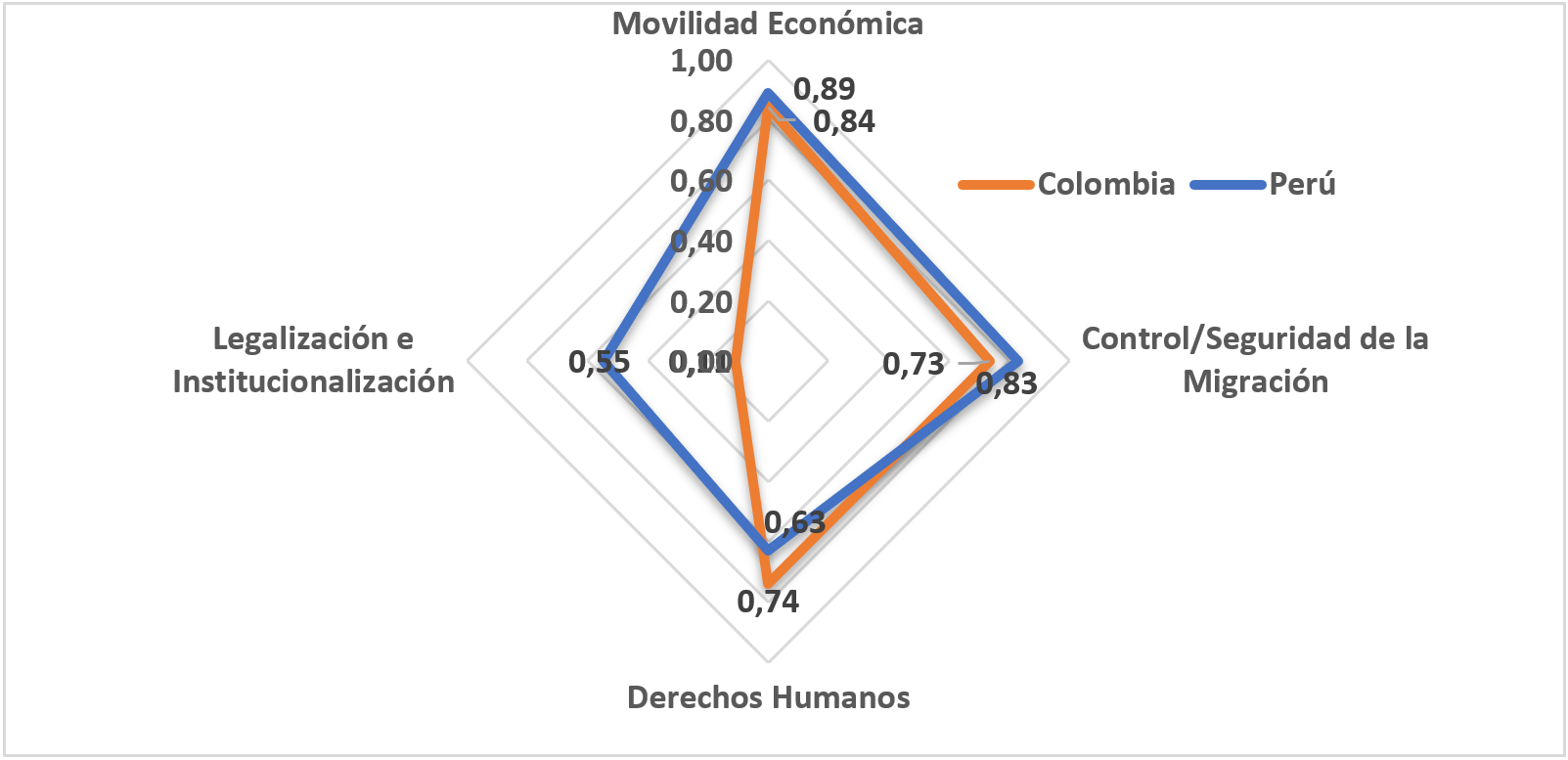 El indicador general para Colombia que habla de la gobernanza regional migratoria proporcionó un valor 0.61, mientras que para Perú asciende a 0.72. El factor más fuerte o desarrollado para ambos países es la movilidad económica, así como el factor más débil para los dos países es la legalización e Institucionalización (en la medida en que existe un bajo nivel regulatorio, sin armonización, sin compromisos ni revisión judicial supranacional). Tanto Colombia como Perú, los derechos humanos presentan un indicador parcial.