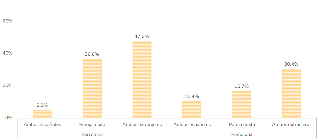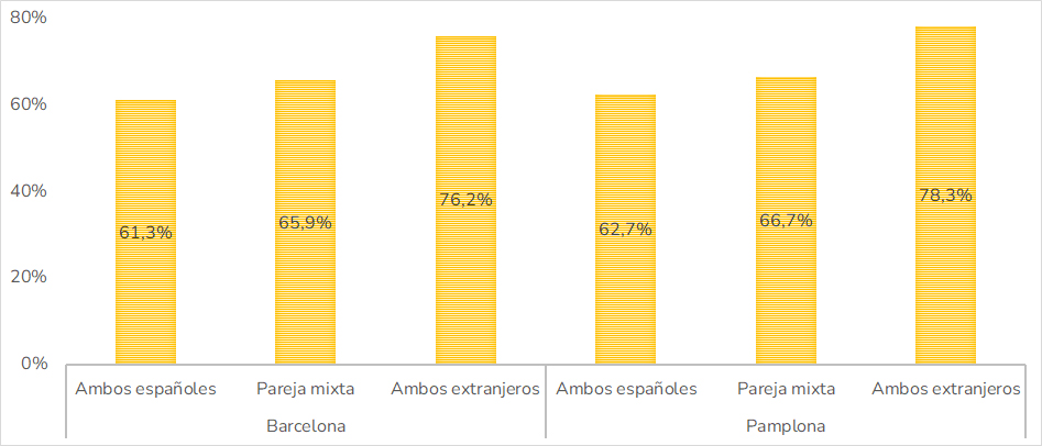 En Barcelona las diferencias no son significativas (p-valor=0,746), pero sí en Pamplona (p-valor=0,048). En Pamplona existe una mayor presencia de uniones consensuales entre matrimonios mixtos y extranjeros (66,7% y 60,9%, respectivamente), que la que existe entre matrimonios formados exclusivamente por españoles (40,3%).