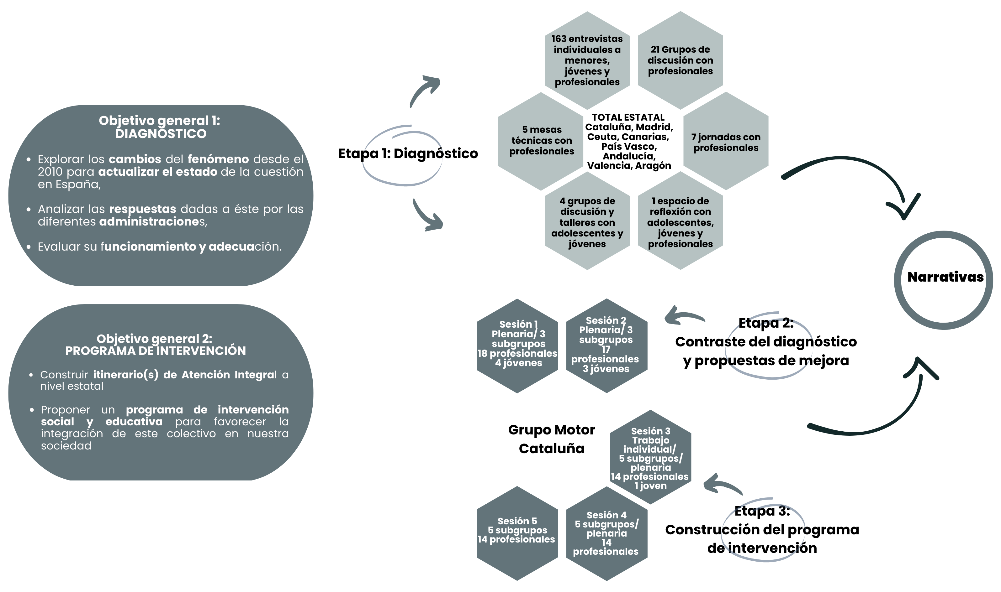 La investigación se inicia en el año 2018 y plantea, tal y como recoge la figura 1, explorar los cambios que se han producido en los últimos años en la realidad de los/las adolescentes y jóvenes que realizan el viaje migratorio de manera autónoma. Interesaba analizar las respuestas que se están planteando en el circuito de atención desde las diversas comunidades autónomas participantes en el proyecto4, así como identificar cuáles son las prácticas y los modelos de intervención que se están desarrollando para atender las necesidades y demandas de estos/as adolescentes y jóvenes, evaluando conjuntamente, con ellos y los/as profesionales, su funcionamiento y adecuación, así como el efecto que tienen en su bienestar.