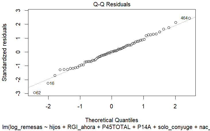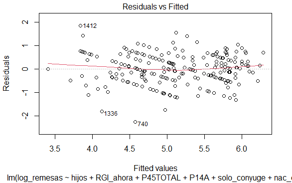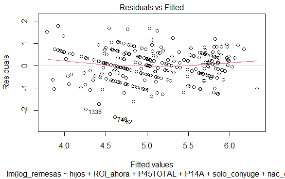 En la regresión lineal se han utilizado las mismas variables explicativas, pero tomando como variable dependiente el logaritmo de las remesas enviadas. Esta transformación se ha realizado porque aparecía un problema de no linealidad.