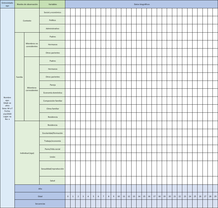 Para sistematizar los resultados, se utilizó la versión renovada de la matriz Ageven, una herramienta que permite representar todos los datos biográficos de un individuo ego, es decir de la persona migrante entrevistada, en cada una de las trayectorias (educativa, laboral, migratoria, reproductiva etc.) que estructuran su curso de vida (Cavagnoud et al., 2019). Este instrumento facilita la comprensión de la ocurrencia de ciertos eventos como la migración, en función de otros eventos anteriores, especialmente en el nivel contextual situado en la parte superior de la matriz, que permite registrar y visualizar información de índole social, económica y política. Asimismo, incluye un nivel familiar desagregado entre los miembros coresidentes y no coresidentes de ego, lo cual permite observar información biográfica sobre los distintos miembros de la familia antes y después de la migración a Perú (u otro país de la región), la evolución de las relaciones de ego con cada familiar (migrante o no migrante), así como la naturaleza de los vínculos con los miembros no coresidentes que se quedaron en Venezuela o que migraron a otro país (ver figura 1). Todo esto permite analizar el papel de la familia en la decisión de migrar de ego, la organización doméstica post migratoria y la pertinencia de la aplicación del concepto de familiar transnacional.