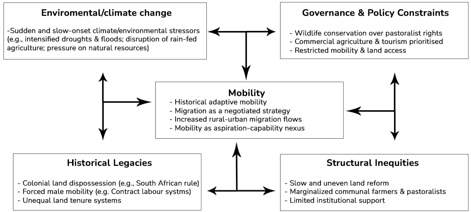 These vulnerabilities, rooted in historical processes of colonial land dispossession, apartheid-era spatial segregation, and post-independence land reform failures, have resulted in highly unequal access to land and productive resources, particularly among indigenous and rural populations. Moreover, contemporary governance systems, marked by fragmented institutional support, insufficient investment in rural infrastructure, and top-down policy approaches, further limit local adaptive capacity and amplify the impact of climatic variability. In this context, mobility emerges not merely as an emergency reaction but as a strategically negotiated adaptation, often drawing on longstanding cultural practices such as pastoralist transhumance, cyclical labour migration, and multi-sited livelihoods. Such practices reflect not only resilience and innovation but also agency and intergenerational knowledge, rather than passive victimhood.