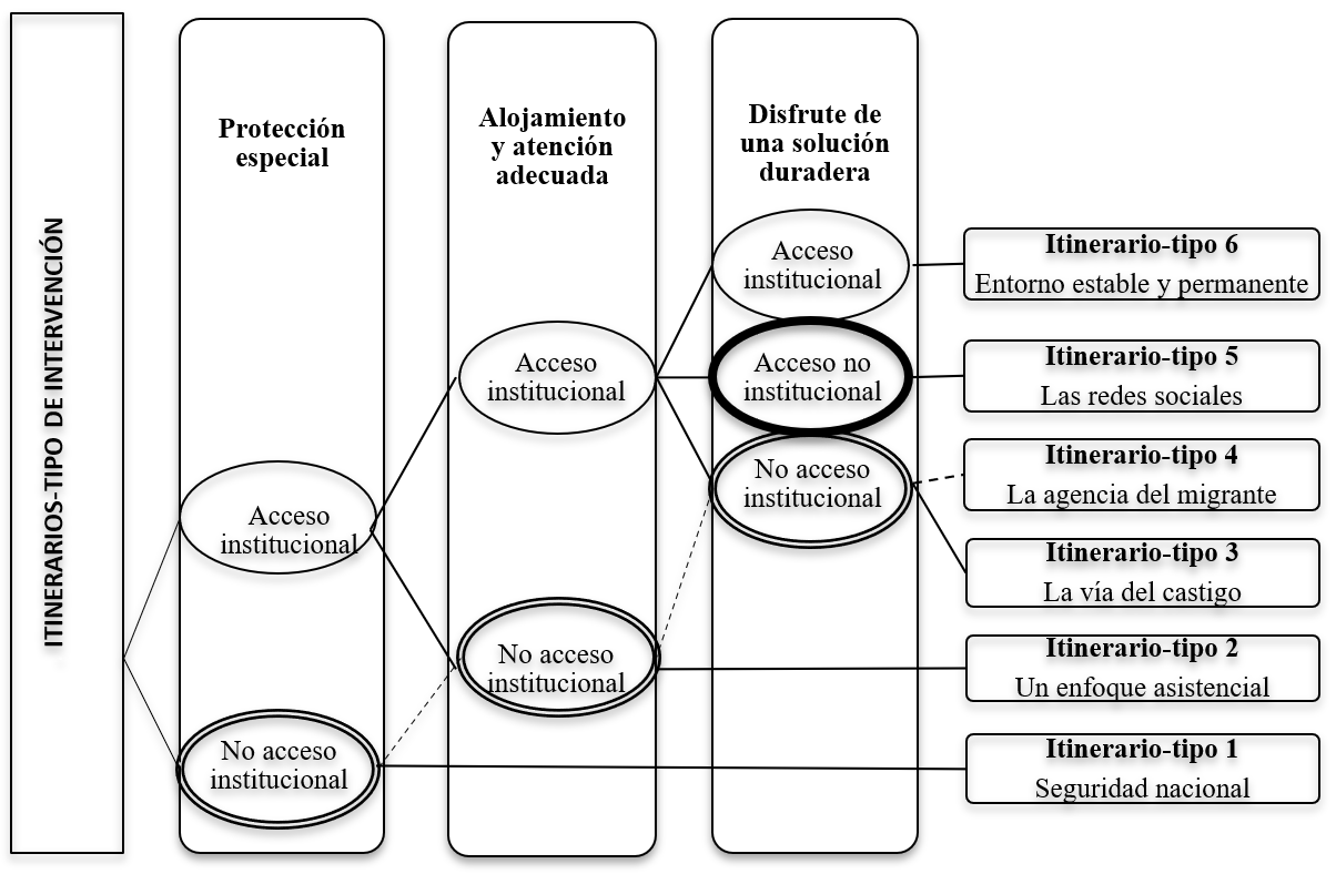 | Itinerario-tipo | 1. Fronteras en el acceso a la protección: antes migrante que NNA | 2. De la protección a la desprotección | 3. La vía del castigo | 4. La agencia del migrante | 5. El apoyo de redes sociales | 6. Un entorno estable y permanente | |||