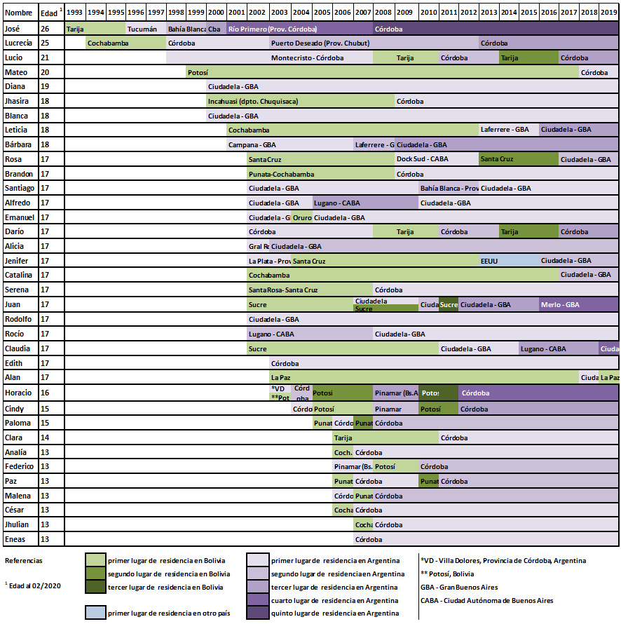 La presencia histórica de este colectivo migratorio en la Argentina y las distintas transformaciones que sus desplazamientos territoriales han ido atravesando constituyen un punto de partida necesario para el análisis de las movilidades juveniles contemporáneas. A lo largo de nuestras indagaciones, y como se puede observar en la siguiente tabla, nos hemos encontrado con un universo muy heterogéneo de jóvenes que se han movilizado por distintos territorios entre Bolivia y Argentina. Algunos de ellos han nacido “acá” y otros “allá”; algunos han migrado recientemente y otros cuentan con una permanencia prolongada en la Argentina; algunos han ido de visita sin haber residido nunca en Bolivia.