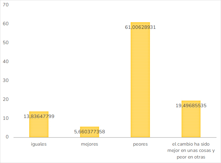 Al preguntarles cómo percibían su actual experiencia laboral en comparación a la que tenían antes de la pandemia, el 61% considera que las condiciones de trabajo al momento de la encuesta eran peores (ver gráfico 3). Las razones son variadas, pero resaltan que el salario ofrecido era menor y las jornadas más largas. También ‘se vende menos’ en el caso de aquellas dedicándose al comercio. En segundo lugar, notamos la preocupación a ser expuestas a algún peligro. Este puede ser el mismo virus y, con ello, exponer a sus familiares, o algún acto de discriminación o violencia como el descrito líneas arriba por Ana. Por último y en menor medida, argumentaban que las condiciones laborales eran peores al no contar con las herramientas para poder hacer trabajo virtual. Este era el caso de Rosa —64 años, artista plástica— y de Betty —35 años, docente—, que estaban trabajando como profesoras particulares antes de la pandemia y al no contar con computadora o un buen acceso al internet no pudieron continuar con su trabajo durante la inmovilización social obligatoria.