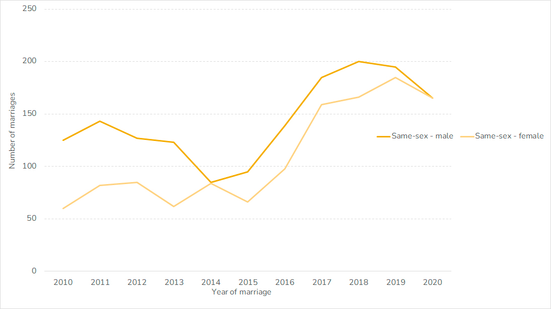 It is also important to highlight that, compared to binational heterosexual couples in the same period (2010-2020), the couples consisting of two persons of the same sex have a lower average age upon marriage; in the case of couples composed of people of opposite sex, the average ages are 40.2 years old and 36.2 years old for men and women respectively.