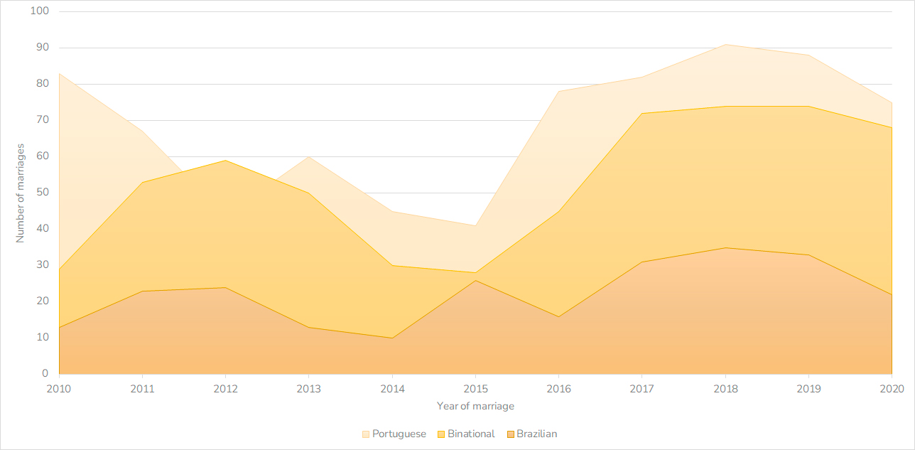 The number of foreign residents has been growing steadily in Portugal, and the Brazilian community has become increasingly important, soaring from 22,202 people in 2000 to 204,669 in 2021, according to data from the Portuguese Immigration and Borders Service. From 2007, people with Brazilian nationality became the most populous foreign community, maintaining this position until 2021, when it represented more than 29% of the total foreign residents in Portugal. As expected, this evolution reverberates on many levels, namely in the context of marriage, with a swelling number of binational marriages between Portuguese and Brazilians. In a context where migrations is increasingly present, it is fundamental to understand how cultures meet, especially in terms of family and intimacy. As such, research on binational marriages in general is important and necessary.