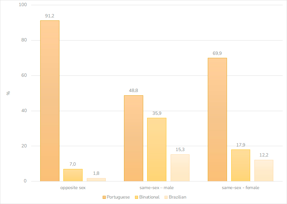 In the decade since gay marriage was legalised in Portugal (2010-20), 2794 same-sex marriages have been celebrated involving Portuguese or Brazilians. Of these, 57.1% (N=1596) were between two Portuguese, 14.1% (N=394) were between two Brazilians, and the rest (28.8%; N=804) corresponded to binational marriages, in which one of the spouses was born in Portugal and the other in Brazil.