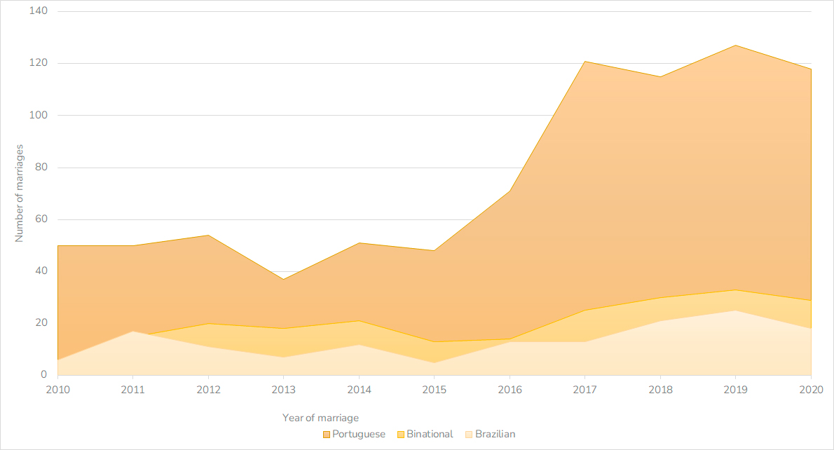Following an initial period of growth, right after the legalisation of these marriages, between 2012 and 2015 (corresponding to the period of economic and financial crisis experienced in Portugal) there was a decline, indeed a common situation across the different types of couples, with different origins. A new cycle was set in motion from 2015, with particularly significant growth of binational marriages which, between 2016 and 2019, increased by approximately 80% (among the Portuguese this growth stood at 44%). In the case of marriages between two Brazilians, the increase only occurred in 2017, probably constrained by the actual evolution of the migratory movements between Brazil and Portugal. As would be expected, in 2020 there was a renewed drop in the number of marriages (total and by groups), this time explained by the pandemic.5