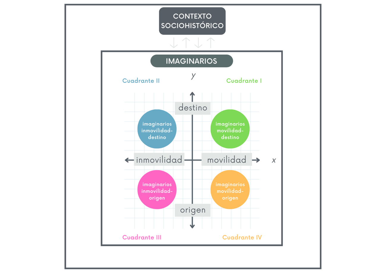 Recuperando, entonces, la teoría de imaginarios sociales y las aportaciones de los estudios sobre la movilidad humana, aquí se entenderán los imaginarios de la (in)movilidad (Salazar, 2011) como esquemas simbólicos que articulan y dan sentido a los posicionamientos relativos de distintos actores sociales respecto de los continuos inmovilidad-movilidad y origen-destino. Estos esquemas se expresan en discursos cuyas condiciones y producción, circulación y consumo son indisociables de las disputas de poder existentes en cada sociedad y en cada momento histórico en torno a los desplazamientos humanos.