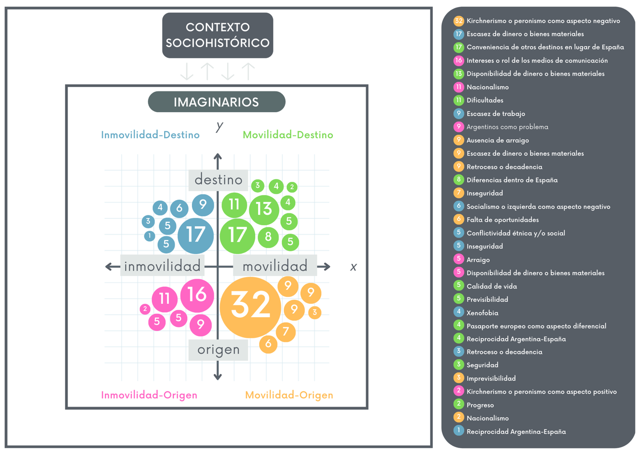 En segundo término, al intersectar ambos ejes para obtener las cuatro combinaciones principales que el modelo propuesto permite identificar, la tipología más frecuente refiere a la movilidad vinculada a valoraciones en general negativas sobre el país de origen, con 75 citas, seguida por la que se vincula a la movilidad asociada a percepciones mayormente positivas del país de destino, con 72 citas. Les siguen a ellas, con menor cantidad de menciones, los imaginarios de la inmovilidad asociada a evaluaciones generalmente desfavorables sobre el país de destino, con 50 citas y, por último, los de la inmovilidad relacionada con percepciones mayoritariamente favorables del país de origen, con 48 citas. En resumen, los imaginarios de la movilidad se estructuran en una tenue mayoría en torno a evaluaciones negativas sobre el contexto sociohistórico argentino y, en una medida apenas menor, en valoraciones positivas sobre el entorno sociohistórico español. Por su parte, los imaginarios de la inmovilidad se apoyan en una pequeña mayoría en estimaciones desventajosas sobre España y, en una medida apenas menor, en caracterizaciones ventajosas de la Argentina que justifican la conveniencia de permanecer allí.