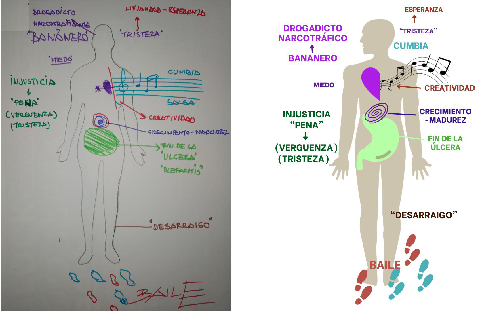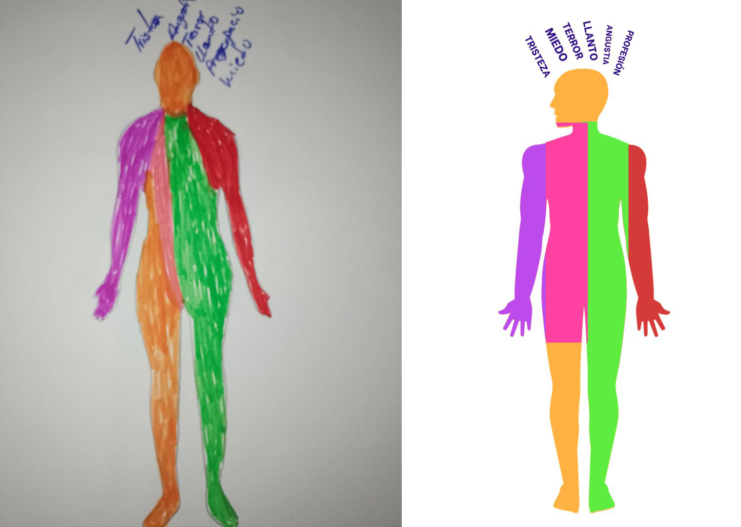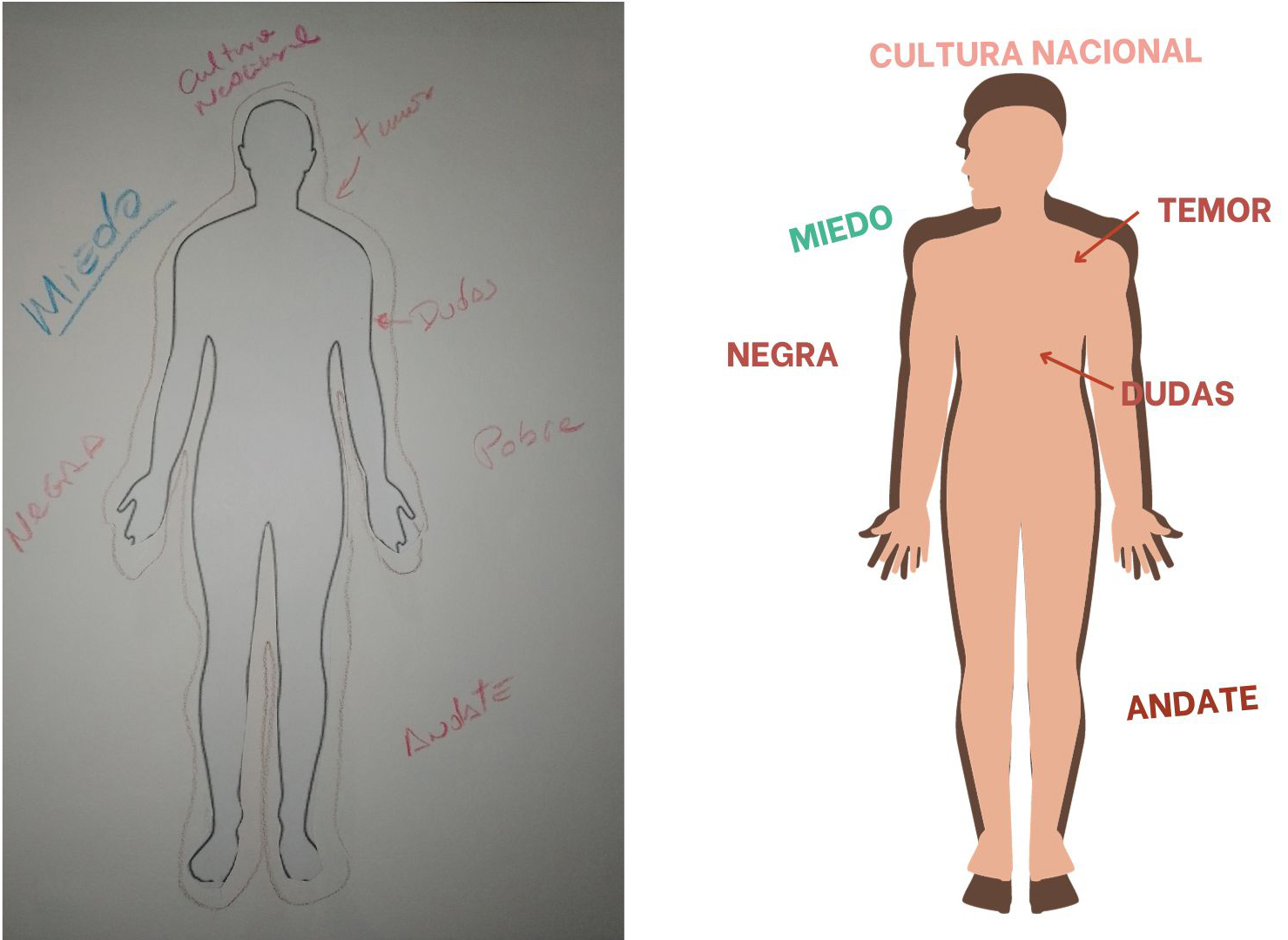 Para el desarrollo de las cartografías corporales se entregaron dos dibujos de la silueta de un cuerpo que referenciaban el antes y después de unirse a la Coordinadora, y se le solicitó a cada entrevistada/o ir plasmando gráficamente las emociones, los afectos, los símbolos y los pensamientos asociados a su experiencia de migrar a Chile y su decisión de formar parte de la organización. Para ello se dispuso de materiales como marcadores de diferentes colores y recortes.