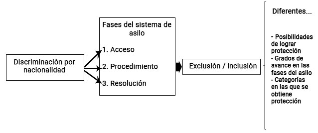 La gobernanza global de las migraciones, en el que destacan las políticas de control, está en gran medida basada en la discriminación. El trato discriminatorio se produce, al menos, en un doble sentido. Por un lado, debido a los procesos de categorización y la falsa dicotomía entre migrantes —por motivos económicos— y refugiados —por la persecución política—, que opaca y excluye a los migrantes forzados que no encajan con las definiciones de refugiado al uso (McAdam, 2006; Ceriani, 2016). Por otro lado, como consecuencia de que existen múltiples factores que modulan e implican discriminación en las políticas de asilo (u otras figuras de protección) según nacionalidad. No hay que olvidar que las leyes y prácticas también están atravesadas por otras categorías, tales como la clase social, el género, la orientación sexual o la etnicidad/la raza. No obstante, este trabajo se centra en la categoría de nacionalidad por tratarse de uno de los elementos centrales en esta diferenciación en la implementación de las políticas de asilo y el reconocimiento de protección en ambos países.