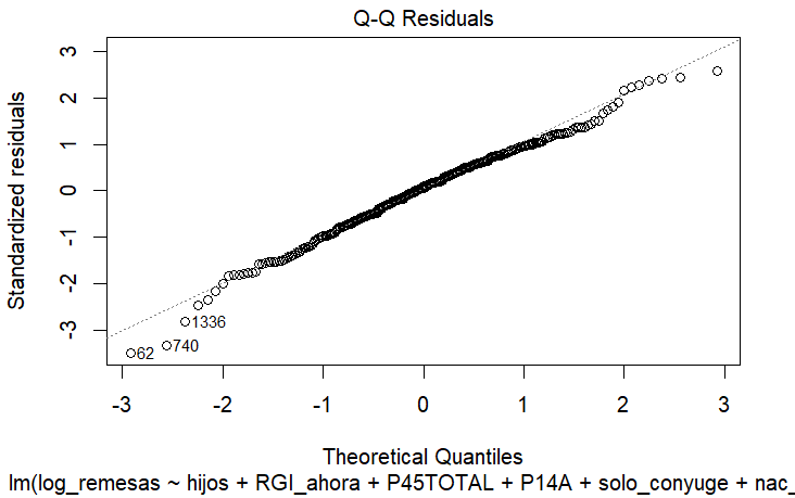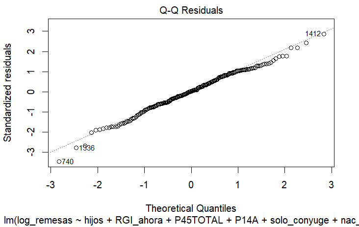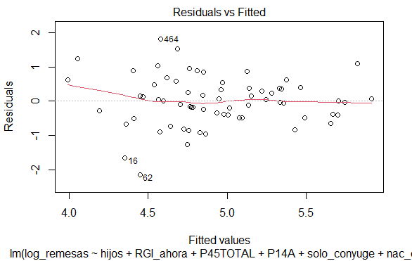 En la regresión lineal se han utilizado las mismas variables explicativas, pero tomando como variable dependiente el logaritmo de las remesas enviadas. Esta transformación se ha realizado porque aparecía un problema de no linealidad.