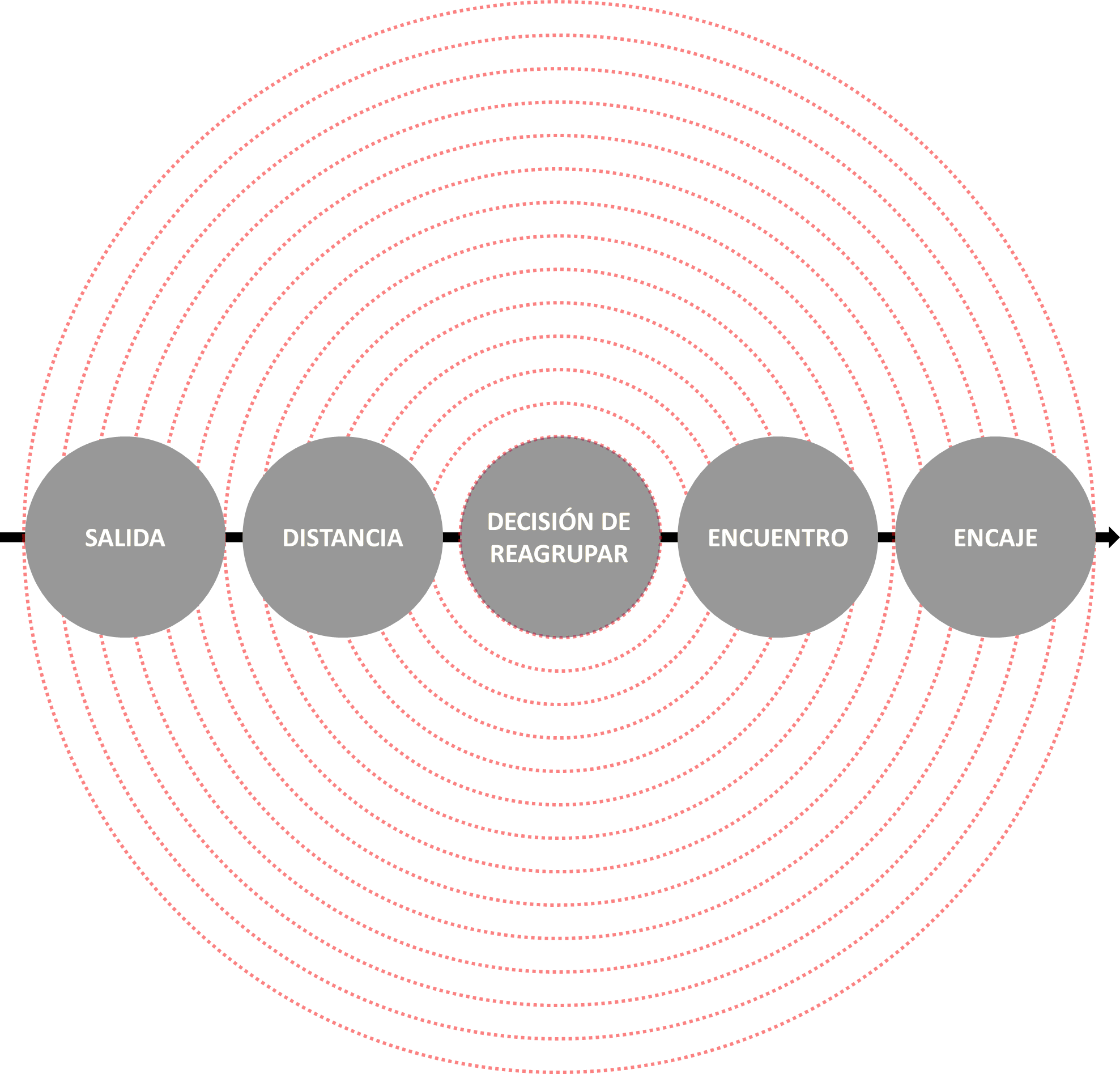 La evidencia empírica permite articular este apartado como una propuesta analítica a través de cinco etapas presentes en los procesos de reagrupación: salida, distancia, decisión de reagrupar, reencuentro y encaje. Aunque estas etapas se suceden (figura 1), la decisión de reagrupar permea el proceso de principio a fin.