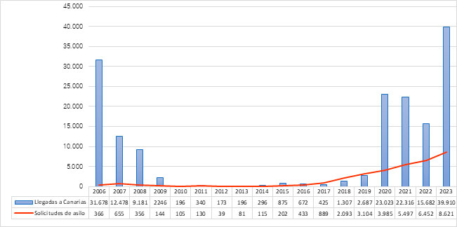 | Año | Llegadas irregulares por vía marítima registradas en Canarias | Provincia de Las Palmas | Provincia de S. C. de Tenerife | Canarias | España | % de solicitudes de asilo en Canarias respecto a España |