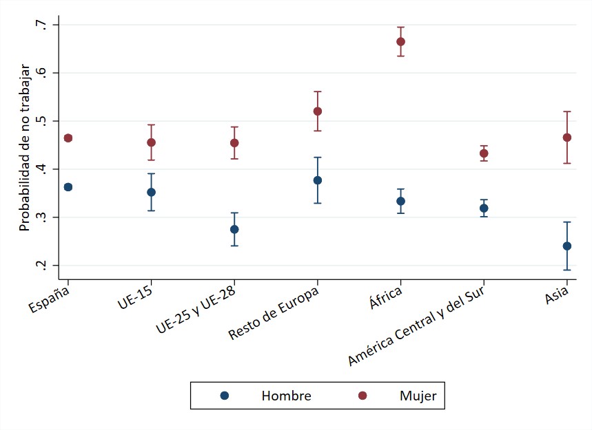 • H2.1. Las mujeres inmigrantes presentan mayor probabilidad de no trabajar que las españolas y que los hombres inmigrantes y este efecto —que varía según el origen— es particularmente evidente entre las africanas.