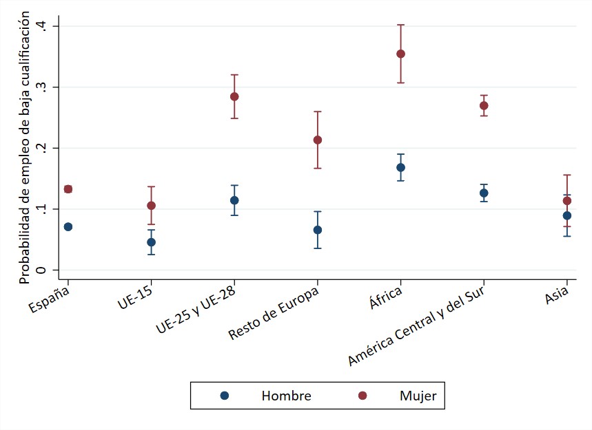 De este modo, los hombres inmigrantes presentan menor probabilidad de tener un empleo poco cualificado que las mujeres, pero solo los orígenes de UE-25 y UE-28, África y América Central y del Sur se encuentran en situación de desventaja con respecto a los españoles. Ello desvela que, pese a que estos orígenes protegían de la probabilidad de no trabajar, no disminuyen el riesgo de tener un empleo no cualificado.