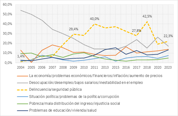 Ahora bien, un factor estructural push soslayado por la literatura antecedente sobre la migración uruguaya en España es el crecimiento (objetivo y/o subjetivo) de la delincuencia y la inseguridad pública1. En el caso que nos ocupa, este elemento adquiere centralidad a partir del segundo ciclo del nuevo milenio, caracterizado por una migración neta favorable a Uruguay (2009-2015). En particular, el fenómeno es considerado por la opinión pública uruguaya como el problema más importante del país desde 2009, siendo particularmente elevado el porcentaje de menciones como principal problema registrado durante los gobiernos de Mujica (marzo de 2010-febrero de 2015) y Vázquez (marzo de 2015-febrero de 2020) (Gráfico 2).