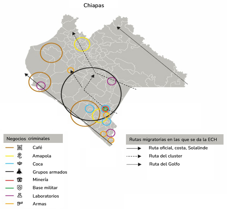 El corazón de la frontera desterritorializada de Estados Unidos en el límite de México con Guatemala está en Chiapas y los municipios guatemaltecos colindantes, donde la disputa entre diversos cárteles por controlar la migración ha intensificado la violencia a partir de 2018, según diversos entrevistados. La economía criminal chiapaneca gira en torno al trasiego de cocaína y actividades asociadas a una geografía transfronteriza que se caracteriza por el rezago socioeconómico, la ausencia estatal salvo en operativos armados, la riqueza natural y la ECH derivada de la migración internacional que cruza el embudo centroamericano hacia Estados Unidos. Entre los negocios más lucrativos destacan el contrabando, el narcotráfico, la producción de drogas sintéticas, la siembra de coca y amapola, el tráfico de armas, la minería ilegal, la delincuencia común y, sobre todo, la ECH que se da en las rutas migratorias que flanquean las geografías en las que se dan esos negocios.